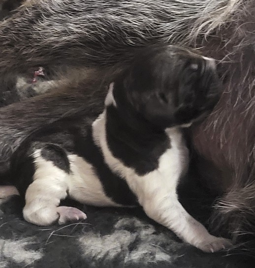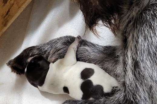 Sie kümmert sich liebvoll und sorgsam um ihren Nachwuchs. Die Welpenkiste steht im mollig warmen Wohnzimmer, so dass ihr Menschenrudel rund um die Uhr immer in der Nähe ist.